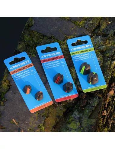 Cresta Supa Plummets zijn met afstand de beste peilloden ooit. De unieke zachte insert bezit over de volledige hoogte een inkeping waar de lijn en de haak in getrokken kan worden. Dit resulteert in de perfecte montage om “staande haak” op de dobberantenne te kunnen uitpeilen. Terwijl de bodemstructuur zichtbaar wordt, blijft de haakpunt volledig afgeschermd en kan deze nooit met het metaal in aanraking komen. Het grote oog maakt het gemakkelijk om elke formaat haak al dan niet voorzien van baitband te monteren. Het allergrootste voordeel is nog wel dat de Supa Plummet in elke positie op de lijn boven de haak geplaatst kan worden. Hierdoor is het mogelijk om ook de gewenste overdiepte op de dobberantenne uit te loden. Meer precisie bestaat niet! De 15gr uitvoering is voor dunnere elastieken, terwijl de 25 en 35gr bedoeld zijn voor gebruik in combinatie met dikkere en/of holle elastiek in de hengeltop.