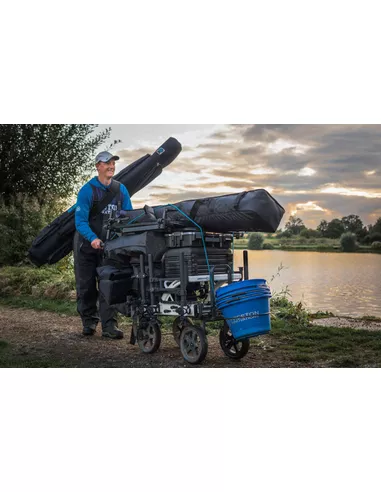 Maakt het vervoer naar de stek bijzonder aangenaam. De ondersteuningsbalk is volledig instelbaar voor vervoer van onze OnBox en Space Station zitboxen en kan ook worden omgedraaid om de kruiwagen geschikt te maken voor veel andere merken zitboxen. Omdat vier wielen al het gewicht dragen, rijd je comfortabel naar de visplek. Het probleem van lekke banden is opgelost door de montage van massieve banden, die kunnen worden ingesteld om meer ruimte onder het frame te creëren. De kruiwagen kan volledig gedemonteerd worden voor vervoer in de auto en om deze thuis op te bergen. Wordt compleet geleverd met opbergzak voor kleding of aas.
