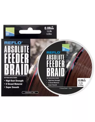 De Preston Reflo Absolute Feeder Braid is zoals de naam al doet vermoeden speciaal ontwikkeld voor het vissen met de feeder. Deze lijn bestaat uit 8 geweven draden, hierdoor is deze gevlochten lijn oersterk, soepel en extra dun. Daarnaast zinkt deze lijn goed af en dankzij zijn gladde oppervlak is de Absolute Feeder Braid ideaal voor verre worpen.